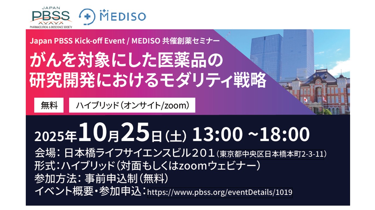2025.09.30【MEDISO共催】一般社団法人 Japan Pharmaceutical & BioScience Society(Japan PBSS)キックオフイベント「がんを対象にした医薬品の研究開発におけるモダリティ戦略」開催のご案内