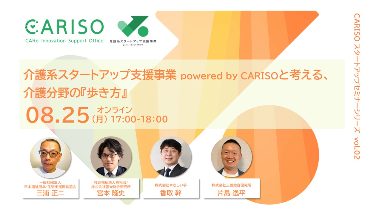 2025.08.01CARISOスタートアップセミナーシリーズ vol.02: 介護系スタートアップ支援事業と考える、介護分野の『歩き方』 のご案内