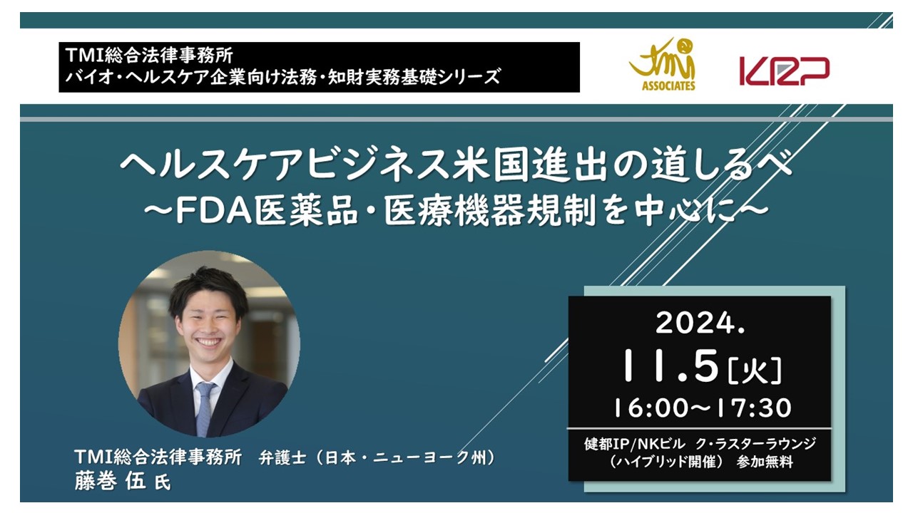 2024.10.08【無料セミナー】ヘルスケアビジネス米国進出の道しるべ ~FDA医薬品・医療機器規制を中心に~ のご案内