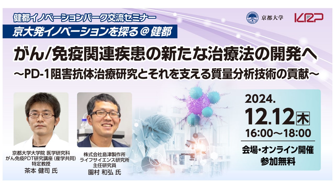 2024.11.18【無料セミナー】<京大発イノベーションを探る@健都>「がん/免疫関連疾患の新たな治療法の開発へ ~PD-1阻害抗体治療研究とそれを支える質量分析技術の貢献~」のご案内