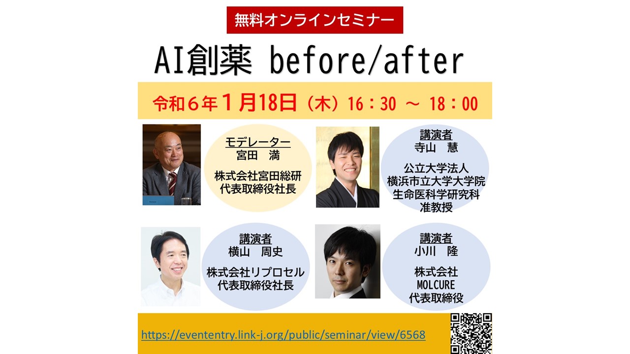 2023.12.20【令和6年1月18日(木)開催】 神奈川県・横浜市・川崎市主催 オンラインセミナー~AI創薬 before/after~