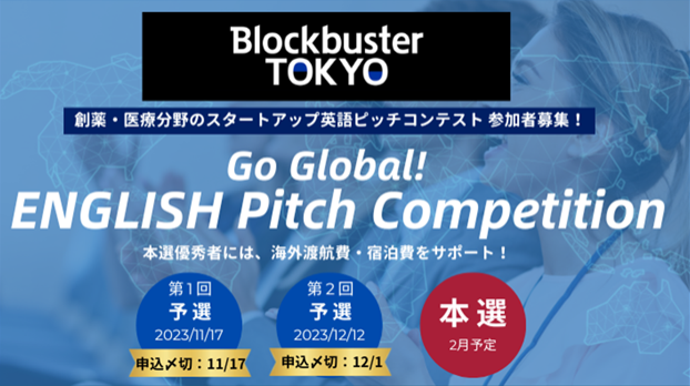 2023.11.07創薬・医療分野のスタートアップ英語ピッチコンテスト「Go Global! ENGLISH Pitch Competition @Blockbuster TOKYO」登壇企業募集!