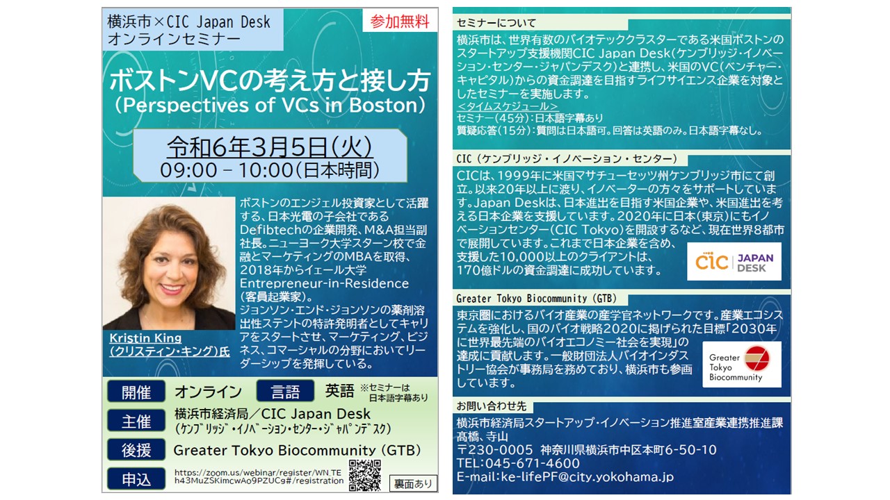 2024.02.20横浜市×CIC Japan Desk オンラインセミナー ~ボストンVCの考え方と接し方(Perspectives of VCs in Boston)~を開催します